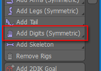We click [Add Digits (Symmetric)] in the main palette. Clicking [Add Digits (Symmetric)] also adds 5 digits rig to the other arm rig in the pair.