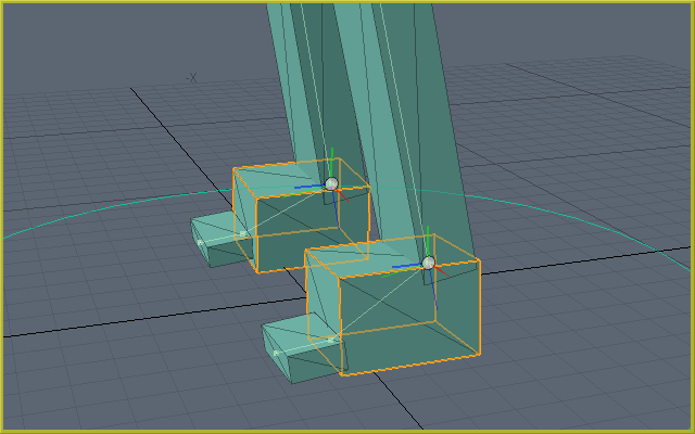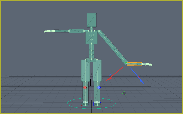 [Pivot Position] is a facility that defines the coordinates used as the rotation origin when rotating 2DIK goals. For example, by setting [Toes (Auto)] to [Pivot Position] and rotating the 2DIK goal along the Z-axis, we can rotate the foot, from the grounded state, with both toes extremities as the origin.