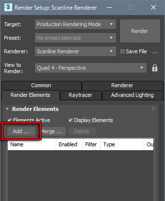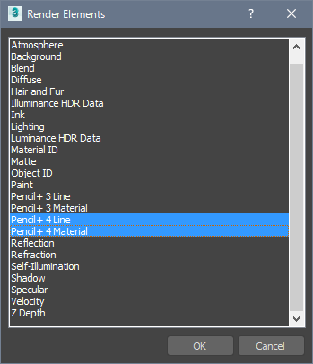 Push the [F10] key to open the [Render Setup] window. Go to the [Render Elements] tab and click [Add...] to open the [Render Elements] dialog. Select [Pencil+ 4 Material] and [Pencil+ 4 Line] then click [OK].