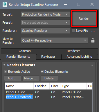 - Add [Pencil+ 4 Material] and [Pencil+ 4 Line] to the Render Elements.