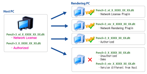 To perform network rendering, you must install the special network rendering plugin on the server PCs. For more details, please refer to the section about network rendering in the product documentation.- The host PC must use an authorized copy or a network license of Pencil+.