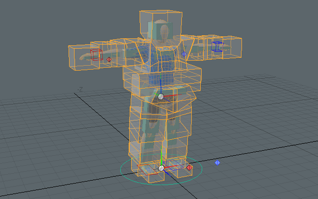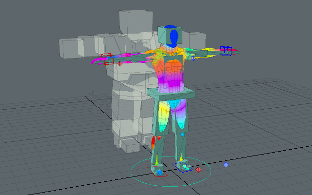 [バインド]は複数のアイテムを選択して実行する事ができます。 ウェイトメッシュからメッシュアイテムへのウェイトマップの転送はワールド座標で実行します。ウェイトメッシュとメッシュアイテムがセットアップモードで重なっている状態で[バインド]を実行する必要があります。メッシュアイテムにサブディビジョンを使用している場合は、サブディビジョン前の頂点位置が箱の内側に収まっている必要があることに注意してください。
