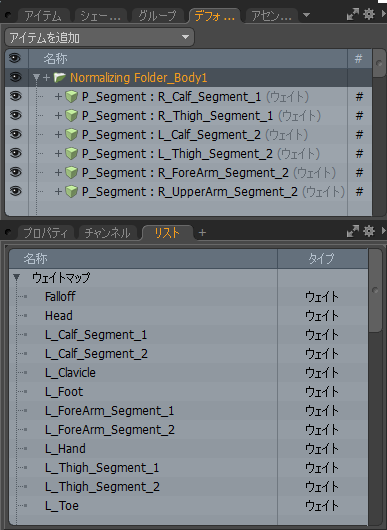デフォーマビューポートで[正規化フォルダ]と[汎用インフルエンス]の追加を確認することができます。CBOXの[バインド]で作成した[汎用インフルエンス]は、[リグを除去]した場合に自動的に削除されます。