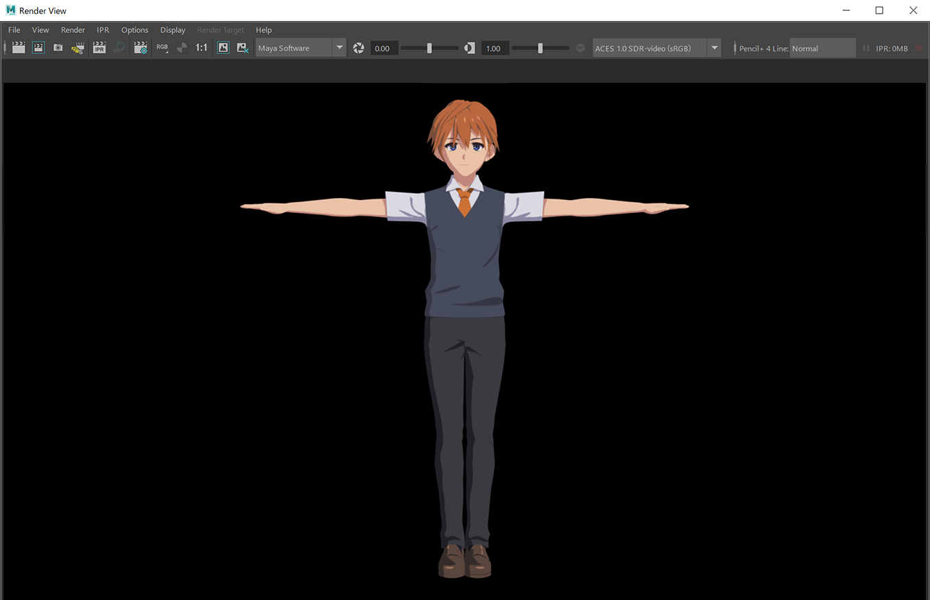 キャラクターモデルに Pencil+ マテリアルを設定してレンダリングした結果、セル画調のレンダリングが得られました。