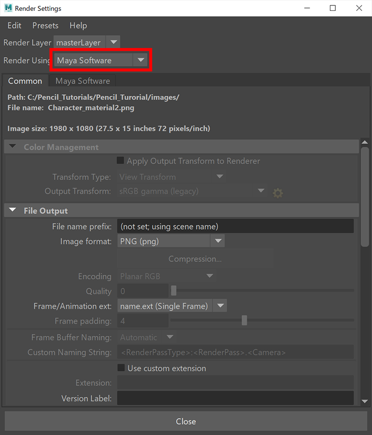 「Pencil+ マテリアルの使い方」と同様に、Pencil+ ラインを使用するには Maya ソフトウェア レンダラに変更する必要があります。