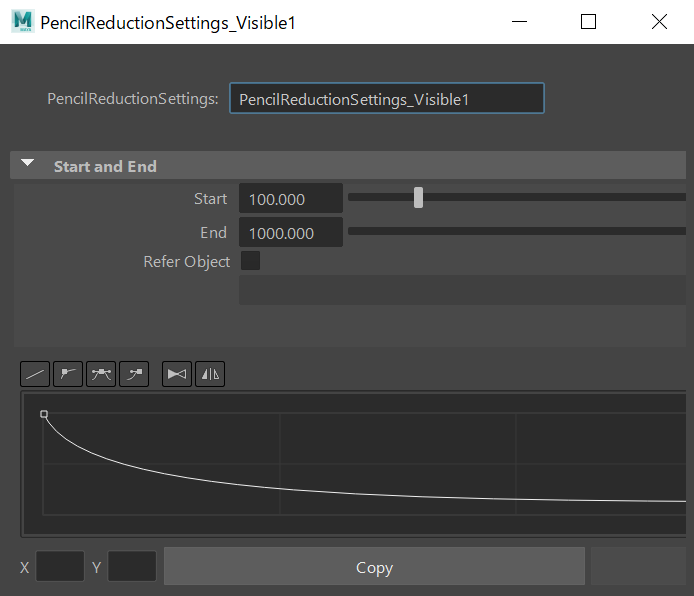 PencilReductionSettings ノードはカメラやオブジェクトからの距離を使用して、ラインの太さや不透明度の変化を設定します。