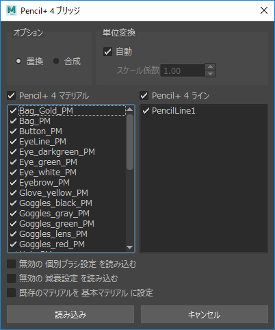「Pencil+ 4 マテリアル」を読み込みます。チェックされていない場合は「Pencil+ 4 マテリアル」を読み込みません。 - Pencil+ 4 ライン