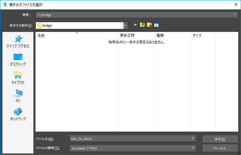 ファイルの種類を[Autodesk(*.FBX)]を選択してファイル名を入力します。[保存]をクリックすると FBX エクスポートウィンドウが開きます。