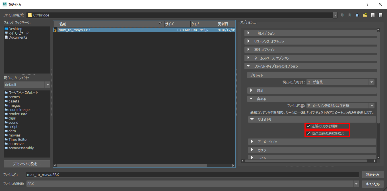 「読み込み」ウィンドウが開きます。3ds Max から書き出したFBXファイルを選択してから右側のオプションの「ファイル タイプ特有のオプション / 含める / ジオメトリ」から[法線のロックを解除]と[頂点単位の法線を結合]を必ず選択してください。他のFBX インポートの詳細設定は必要に応じて行ってください。
