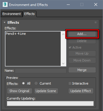 [8]キーを押して[環境と効果]ウィンドウを開いて、効果タブを表示してください。[追加]ボタンをクリックして[効果を追加]ダイアログを表示し、[Pencil+ 4 ファイル出力]を選択して[OK]をクリックしてください。