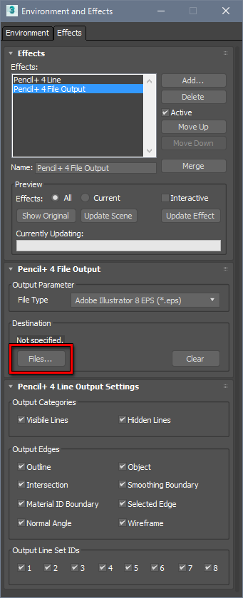 PLD形式ではPencil+ 4 ラインごとに複数のPLDファイルを保存します。出力される場合のファイル名には「入力したファイル名+エフェクト名」が設定されます。ファイル名に <Scene> を設定するとシーンファイル名に置き換えてファイルを保存します。<LineName>を設定するとPencil+ 4 ラインの[名前]に置き換えてファイルを保存します。Pencil+ 4 ラインの[名前]が重複している場合は、名前の最後に連番を追加します。