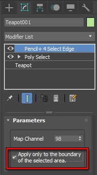 「修正 パネル / モディファイヤリスト」から[Pencil+ 4 選択エッジ]をクリックしてください。つぎに[選択範囲の境界にのみ適用する]をONにしてください。