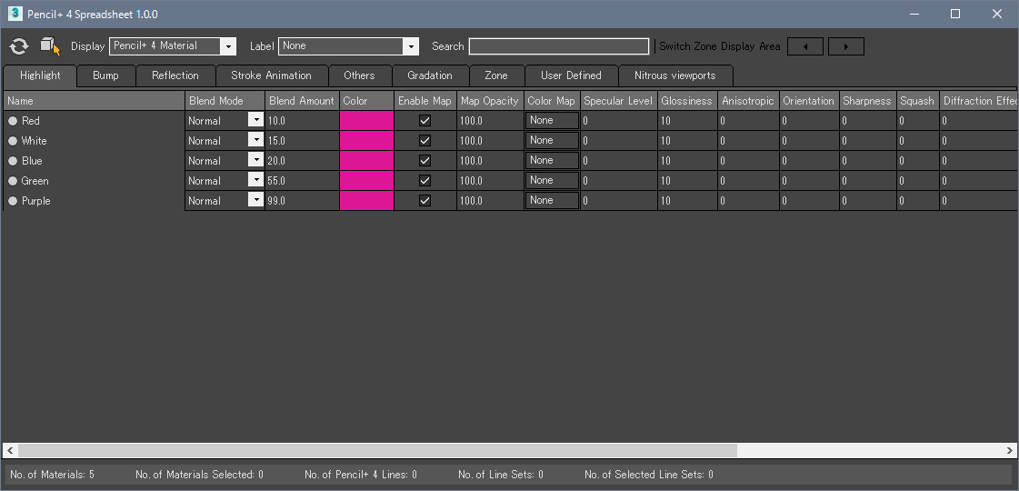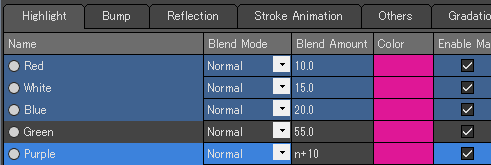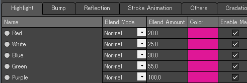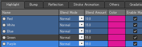 ここでは[ブレンド値]を編集します。ブレンド値カラムの数値をクリックして、値を入力可能な状態にしてください。値を入力してEnterキーを押して入力を確定すると、選択中のマテリアル全ての値を変更することができます。