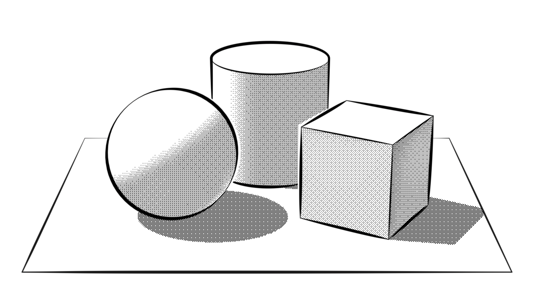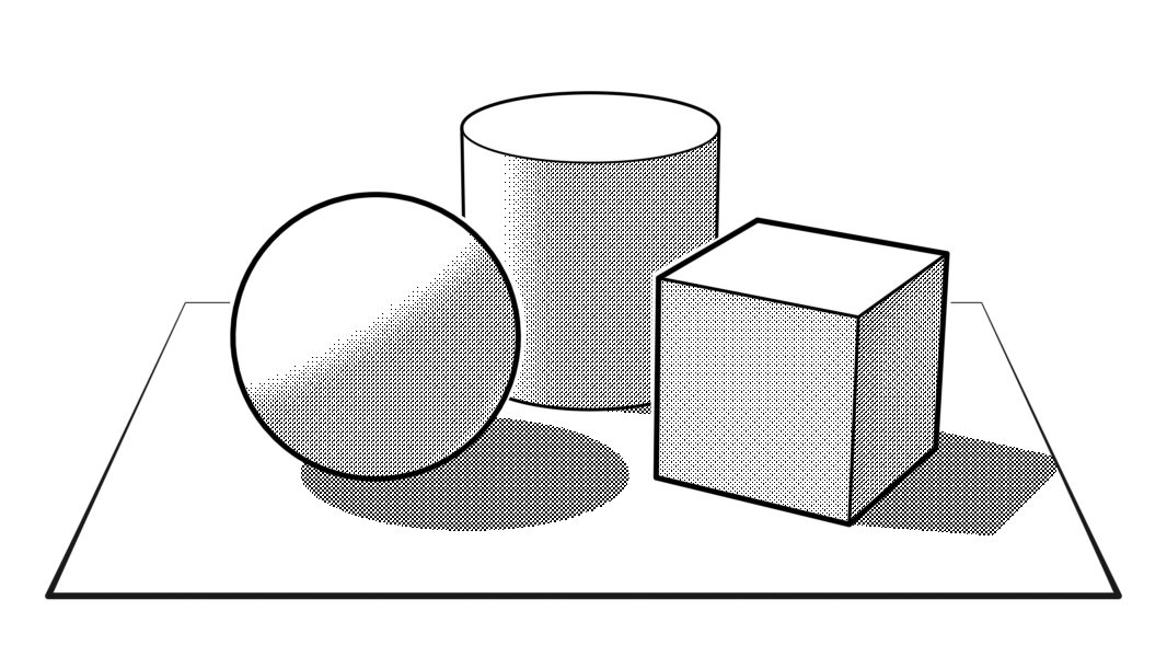 球や立方体より奥にある円柱の線が細くなる。また、立方体や円柱の内側の線を細くしてオブジェクトのシルエットを強調している。