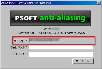 - 開いた [About PSOFT anti-aliasing for Photoshop] ダイアログボックスからマシンコードを確認します。