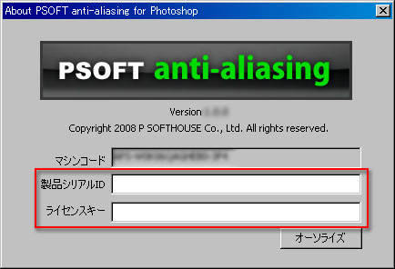 - [About PSOFT anti-aliasing for Photoshop] ダイアログボックスに製品シリアルIDと、ライセンスキーを入力します。(ユーザーページから、コピー&ペーストが可能です。)