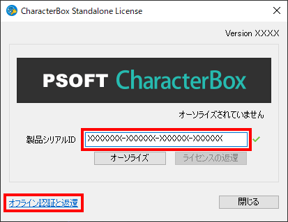 表示された[CharacterBox Standalone License]ダイアログの[製品シリアルID]を入力して下さい。 - [オフライン認証と返還]ダイアログを開く