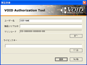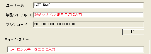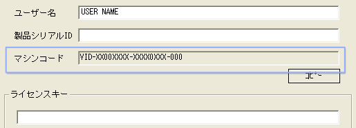 ライセンスキー[空欄]※ここに取得したライセンスキーを入力します。 - 表示されたウィンドウのマシンコードと書かれた項目の右にあるコードがオーソライズに必要なマシンコードになります。