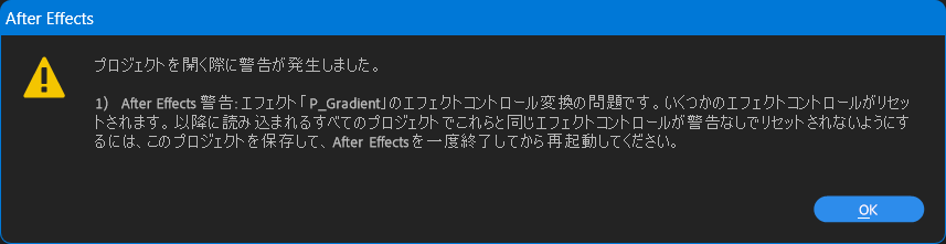 1) After Effects 警告: エフェクト「P_Gradient」のエフェクトコントロール変換の問題です。いくつかのエフェクトコントロールがリセットされます。以降に読み込まれるすべてのプロジェクトでこれらと同じエフェクトコントロールが警告なしでリセットされないようにするには、このプロジェクトを保存して、After Effects を一度終了してから再起動してください。