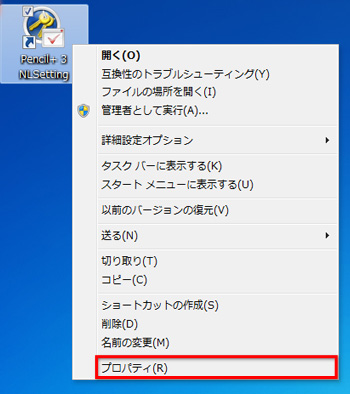 - インストールされた[Pencil+ NLSetting.exe]を右マウスボタンクリックし、OSのコンテキストメニューから[プロパティ]をクリックします。